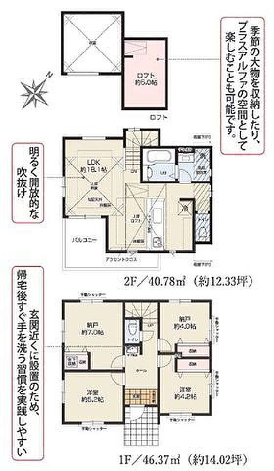 | 間取り | 2SLDK 間取り内訳:リビングダイニングキッチン 18.1帖(2階)・洋室 5.2帖(1階)・洋室 4.2帖(1階)・収納 7帖(1階)・収納 4帖(1階) |