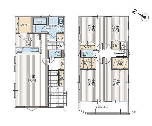 | 間取り | 4LDK 間取り内訳:リビングダイニングキッチン 18帖(1階)・洋室 6.7帖(2階)・洋室 6.7帖(2階)・洋室 5帖(2階)・洋室 5.3帖(2階) |