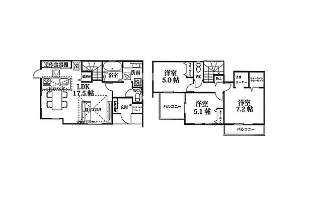 間取り内訳:リビングダイニングキッチン 17.5帖・洋室 5帖・洋室 5.1帖・洋室 7.2帖
