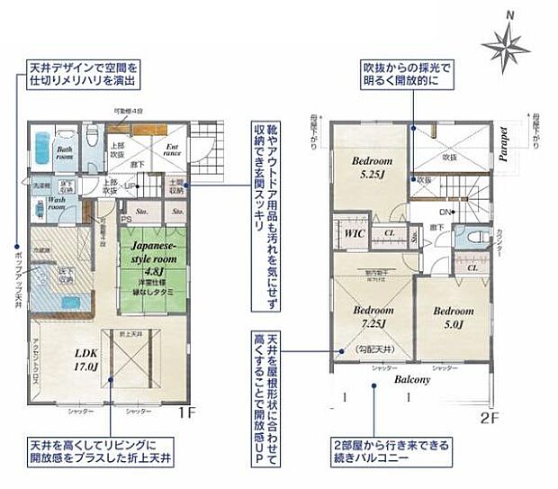 | 間取り | 4LDK 間取り内訳:リビングダイニングキッチン 17帖(1階)・和室 4.8畳(1階)・洋室 5.2帖(2階)・洋室 7.2帖(2階)・洋室 5帖(2階) |