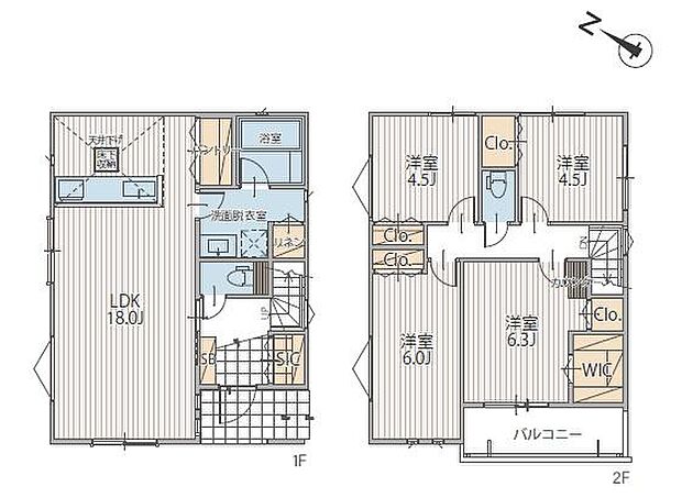 | 間取り | 4LDK 間取り内訳:リビングダイニングキッチン 18帖(1階)・洋室 6帖(2階)・洋室 6.3帖(2階)・洋室 4.5帖(2階)・洋室 4.5帖(2階) |