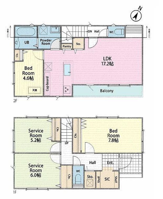| 間取り | 2SLDK 間取り内訳:収納 5.2帖(1階)・収納 6帖(1階)・洋室 7.8帖(1階)・洋室 4.6帖(2階)・リビングダイニングキッチン 17.2帖(2階) |