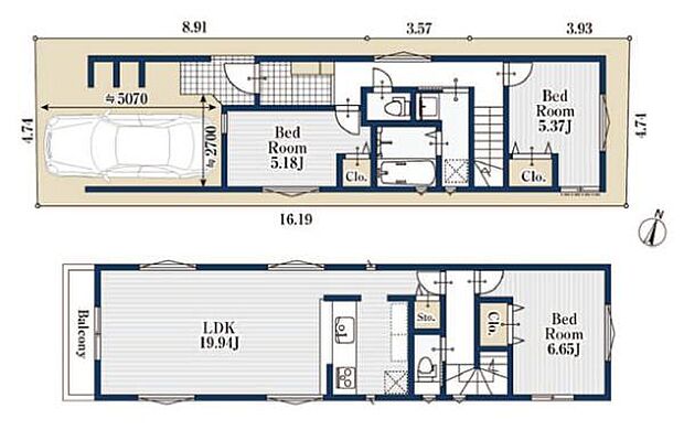 | 間取り | 3LDK 間取り内訳:洋室 5.1帖(1階)・洋室 5.3帖(1階)・リビングダイニングキッチン 19.9帖(2階)・洋室 6.6帖(2階) |