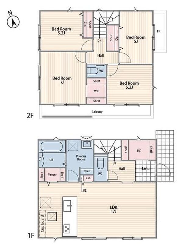 間取り内訳:リビングダイニングキッチン 17帖(1階)・洋室 5.3帖(2階)・洋室 7帖(2階)・洋室 5.3帖(2階)・洋室 5帖(2階)