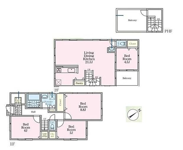 | 間取り | 4LDK 間取り内訳:洋室 6帖(1階)・洋室 5帖(1階)・洋室 8.8帖(1階)・リビングダイニングキッチン 21.5帖(2階)・洋室 4.5帖(2階) |