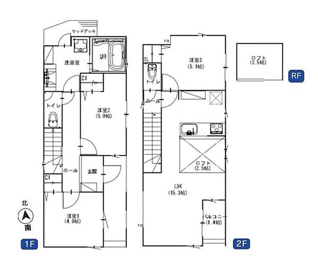 | 間取り | 3LDK 間取り内訳:洋室 5帖(1階)・洋室 4.8帖(1階)・洋室 5.1帖(2階)・リビングダイニングキッチン 15.3帖(2階) |