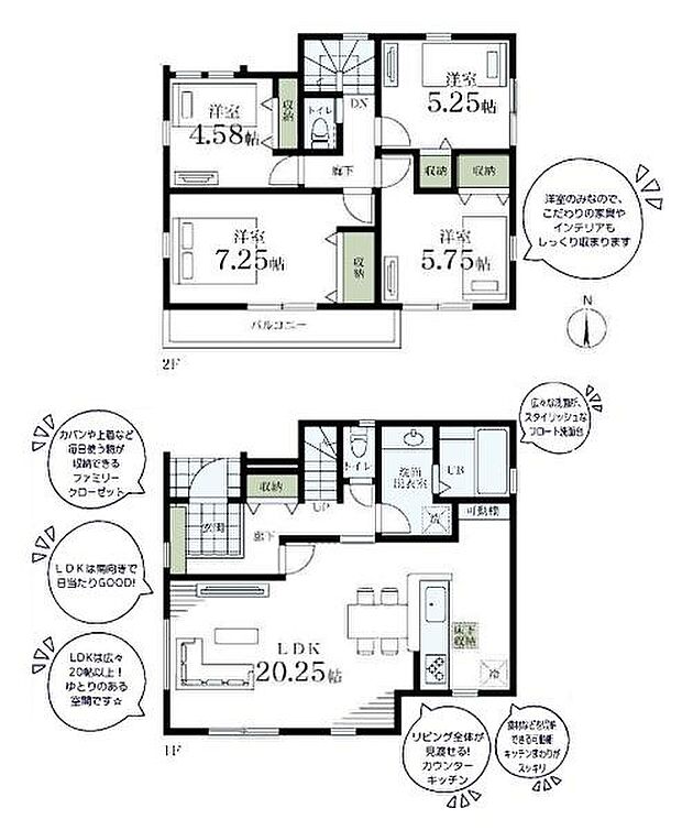 | 間取り | 4LDK 間取り内訳:リビングダイニングキッチン 20.2帖(1階)・洋室 4.5帖(2階)・洋室 7.2帖(2階)・洋室 5.7帖(2階)・洋室 5.2帖(2階) |