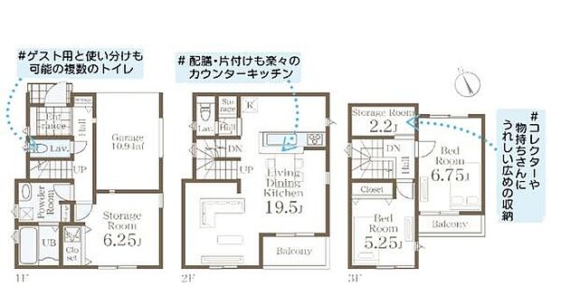 | 間取り | 2SLDK 間取り内訳:収納 6.2帖(1階)・リビングダイニングキッチン 19.5帖(2階)・洋室 5.2帖(3階)・洋室 6.7帖(3階) |