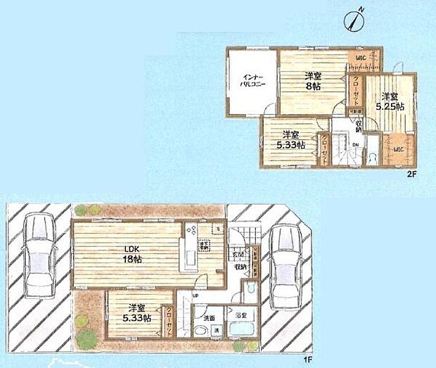| 間取り | 4LDK 間取り内訳:リビングダイニングキッチン 18帖(1階)・洋室 5.3帖(1階)・洋室 8帖(2階)・洋室 5.3帖(2階)・洋室 5.2帖(2階) |