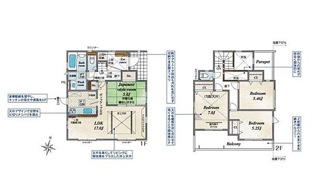 | 間取り | 4LDK 間取り内訳:リビングダイニングキッチン 17帖(1階)・和室 5畳(1階)・洋室 7帖(2階)・洋室 5.2帖(2階)・洋室 5.4帖(2階) |