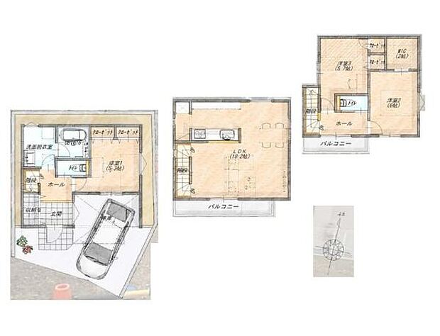 | 間取り | 3LDK 間取り内訳:洋室 5.3帖(1階)・リビングダイニングキッチン 19.2帖(2階)・洋室 5.7帖(3階)・洋室 6帖(3階) |