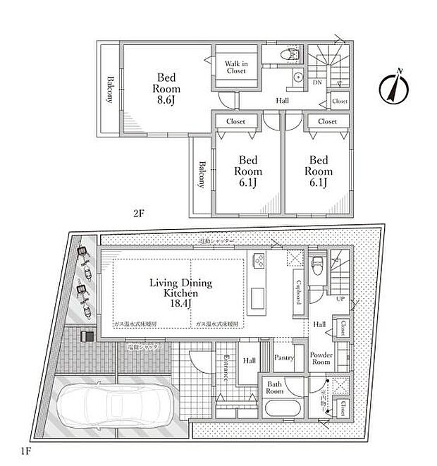 | 間取り | 3LDK 間取り内訳:洋室 6.1帖(2階)・リビングダイニングキッチン 18.4帖(1階)・洋室 8.6帖(2階)・洋室 6.1帖(2階) |