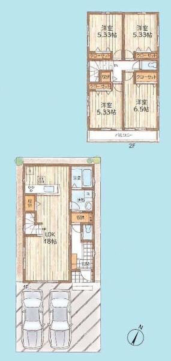 | 間取り | 4LDK 間取り内訳:リビングダイニングキッチン 18帖(1階)・洋室 5.3帖(2階)・洋室 6.5帖(2階)・洋室 5.3帖(2階)・洋室 5.3帖(2階) |