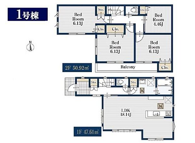 | 間取り | 4LDK 間取り内訳:リビングダイニングキッチン 18.1帖(1階)・洋室 6.1帖(2階)・洋室 6.1帖(2階)・洋室 6.1帖(2階)・洋室 4.4帖(2階) |