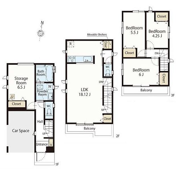 | 間取り | 3SLDK 間取り内訳:収納 6.5帖(1階)・リビングダイニングキッチン 18.1帖(2階)・洋室 5.5帖(3階)・洋室 4.2帖(3階)・洋室 6帖(3階) |