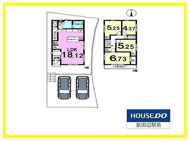 | 間取り | 4LDK 間取り内訳:リビングダイニングキッチン 18.1帖(1階)・洋室 6.7帖(2階)・洋室 5.2帖(2階)・洋室 4.2帖(2階)・洋室 5.2帖(2階) |