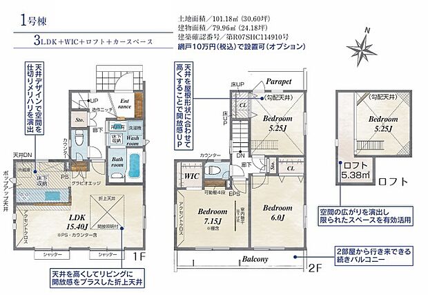 間取り内訳:リビングダイニングキッチン 15.4帖(1階)・洋室 5.2帖(2階)・洋室 6帖(2階)・洋室 7.1帖(2階)