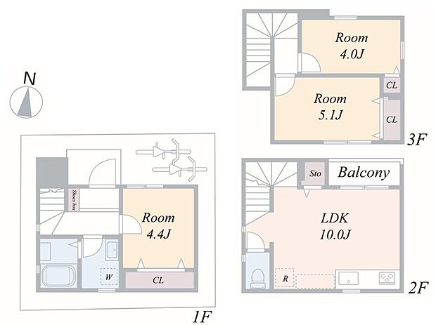 | 間取り | 3LDK 間取り内訳:洋室 4.4帖・リビングダイニングキッチン 10帖・洋室 5.1帖・洋室 4帖 |