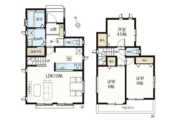 | 間取り | 3LDK 間取り内訳:リビングダイニングキッチン 16帖(1階)・洋室 6帖(2階)x2・洋室 4.5帖(2階) |