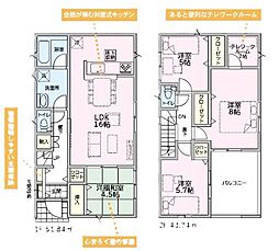 | 間取り | 4LDK(その他:テレワークルーム) 間取り内訳:リビングダイニングキッチン 16帖(1階)・和室 4.5畳(1階)・洋室 8帖(2階)・洋室 5.7帖(2階)・洋室 5帖(2階)・その他 2帖(2階) |
