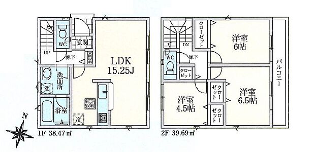 | 間取り | 3LDK 間取り内訳:洋室 6.5帖(2階)・洋室 6帖(2階)・洋室 4.5帖(2階)・リビングダイニングキッチン 15.2帖(1階) |