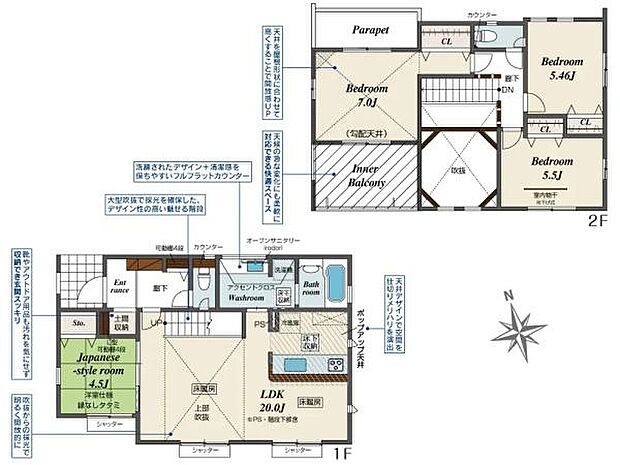 | 間取り | 4LDK 間取り内訳:リビングダイニングキッチン 20帖(1階)・和室 4.5畳(1階)・洋室 7帖(2階)・洋室 5.5帖(2階)・洋室 5.4帖(2階) |