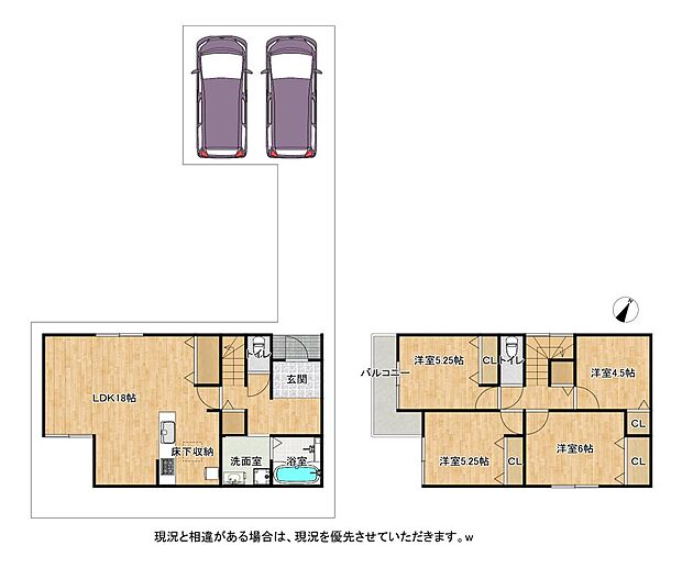 | 間取り | 4LDK 間取り内訳:リビングダイニングキッチン 18帖(1階)・洋室 6帖(2階)・洋室 5.2帖(2階)x2・洋室 4.5帖(2階)x2 |