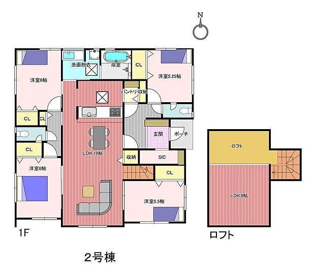 | 間取り | 4LDK 間取り内訳:リビングダイニングキッチン 19帖(1階)・洋室 5.2帖(1階)・洋室 5.5帖(1階)・洋室 6帖(1階)・洋室 6帖(1階) |