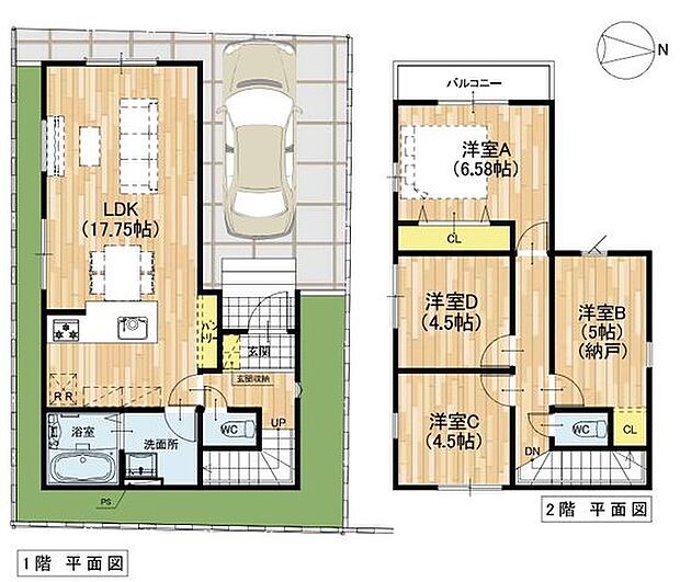 | 間取り | 3SLDK 間取り内訳:リビングダイニングキッチン 17.7帖(1階)・洋室 6.5帖(2階)・洋室 4.5帖(2階)・収納 5帖(2階) |