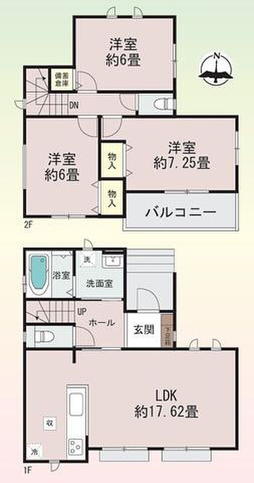 | 間取り | 3LDK 間取り内訳:リビングダイニングキッチン 17.6帖(1階)・洋室 7.2帖(2階)・洋室 6帖(2階)・洋室 6帖(2階) |