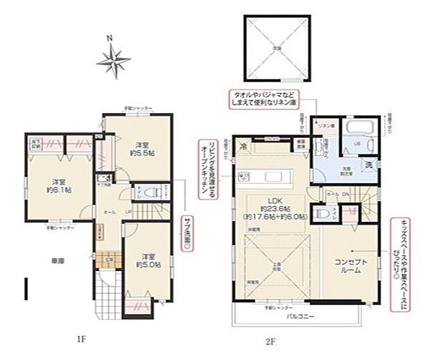 間取り内訳:洋室 6.1帖(1階)・洋室 5.5帖(1階)・洋室 5帖(1階)・リビングダイニングキッチン 23.6帖(2階)