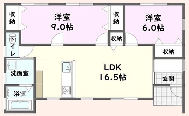 | 間取り | 2LDK 間取り内訳:リビングダイニングキッチン 16.5帖(1階)・洋室 9帖(1階)・洋室 6帖(1階) |