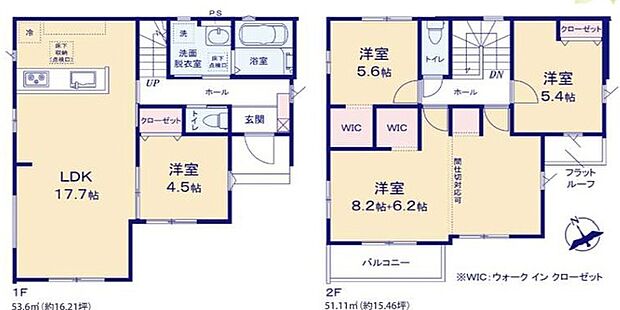 | 間取り | 4LDK(収納多数有り・主寝室間仕切り可能) 間取り内訳:リビングダイニングキッチン 17.7帖・洋室 4.5帖・洋室 14.4帖・洋室 5.6帖・洋室 5.4帖 |