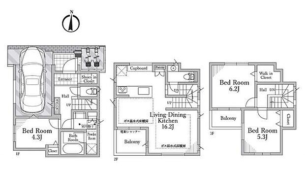 | 間取り | 3LDK 間取り内訳:洋室 4.3帖(1階)・リビングダイニングキッチン 16.2帖(2階)・洋室 6.2帖(3階)・洋室 5.3帖(3階) |