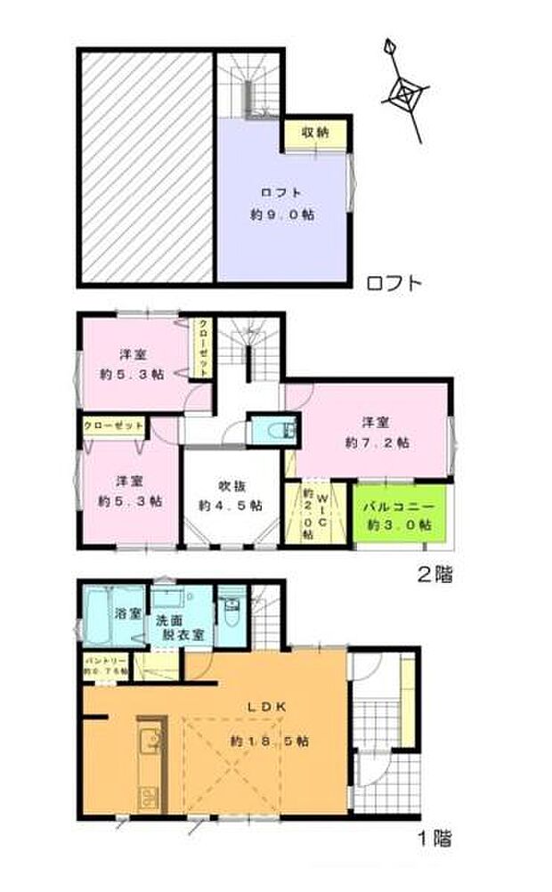 | 間取り | 3LDK 間取り内訳:リビングダイニングキッチン 18.5帖(1階)・洋室 5.3帖(2階)・洋室 5.3帖(2階)・洋室 7.2帖(2階) |