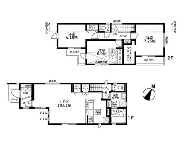 間取り内訳:リビングダイニングキッチン 18.6帖(1階)・洋室 6.1帖(2階)・洋室 6帖(2階)・洋室 7.2帖(2階)