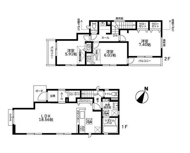 | 間取り | 3LDK 間取り内訳:リビングダイニングキッチン 18.5帖(1階)・洋室 5.9帖(2階)・洋室 6帖(2階)・洋室 7.4帖(2階) |