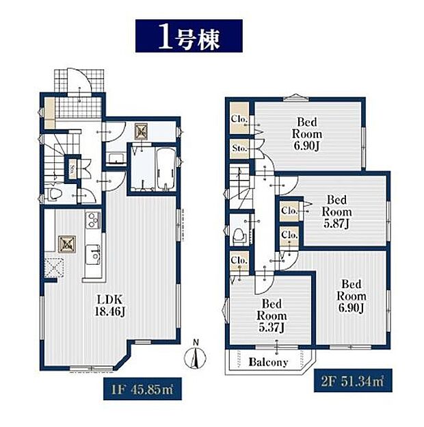 | 間取り | 4LDK 間取り内訳:リビングダイニングキッチン 18帖(1階)・洋室 6.9帖(2階)・洋室 6.9帖(2階)・洋室 5.8帖(2階)・洋室 5.3帖(2階) |