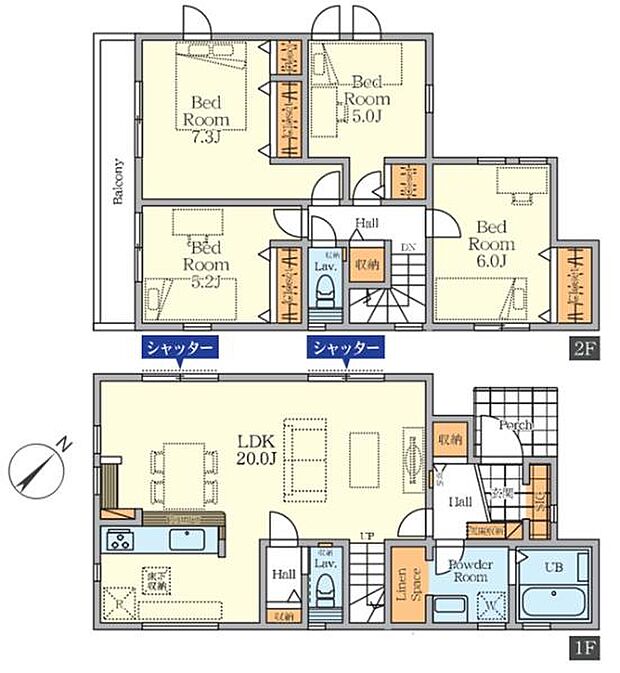 | 間取り | 4LDK 間取り内訳:洋室 7.3帖(2階)・洋室 6帖(2階)・洋室 5.2帖(2階)・洋室 5帖(2階)・リビングダイニングキッチン 20帖(1階) |