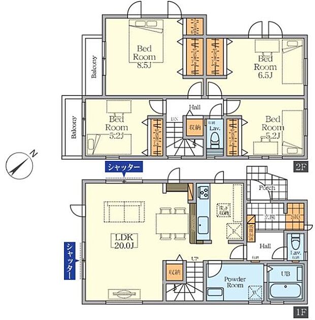| 間取り | 4LDK 間取り内訳:リビングダイニングキッチン 20帖(1階)・洋室 8.5帖(2階)・洋室 6.5帖(2階)・洋室 5.2帖(2階)・洋室 5.2帖(2階) |