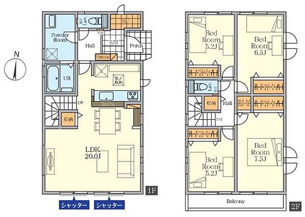 | 間取り | 4LDK 間取り内訳:リビングダイニングキッチン 20帖(1階)・洋室 7.5帖(2階)・洋室 6.5帖(2階)・洋室 5.2帖(2階)・洋室 5.2帖(2階) |