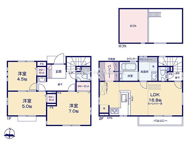 | 間取り | 3LDK 間取り内訳:リビングダイニングキッチン 16.8帖・洋室 7帖・洋室 5帖・洋室 4.5帖 |