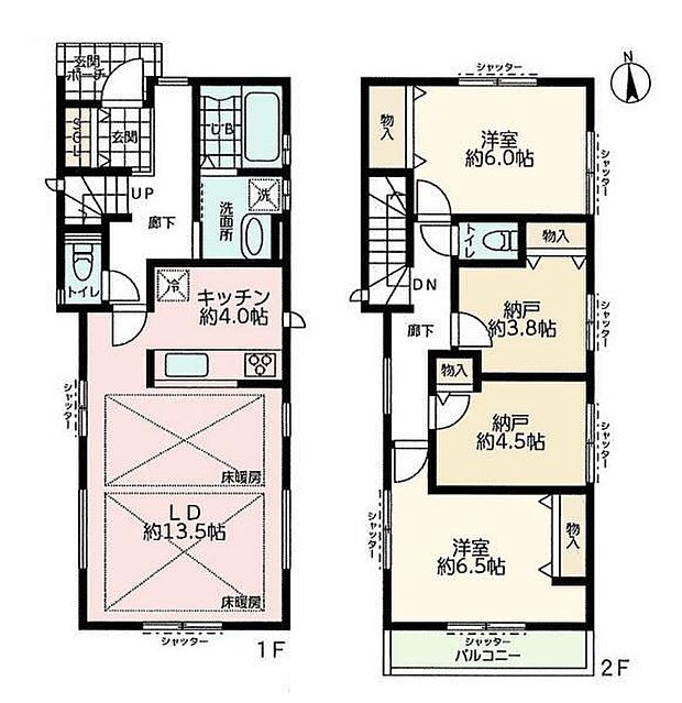 | 間取り | 2SLDK 間取り内訳:リビングダイニングキッチン 17.5帖(1階)・洋室 6帖(2階)・収納 3.8帖(2階)・収納 4.5帖(2階)・洋室 6.5帖(2階) |