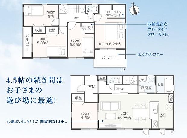 | 間取り | 5LDK(5LDK+ウォークインクローゼット) 間取り内訳:洋室 5帖(2階)・洋室 5帖(2階)・リビングダイニングキッチン 16.7帖(1階)・洋室 4.5帖(1階)・洋室 6.2帖(2階)・洋室 5.8帖(2階) |