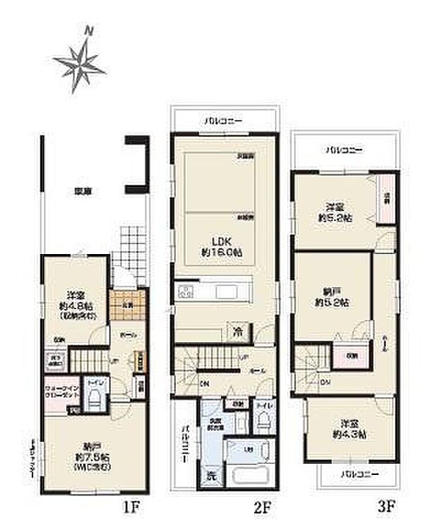 | 間取り | 3SLDK 間取り内訳:洋室 4.8帖(1階)・収納 7.5帖(1階)・リビングダイニングキッチン 16帖(2階)・洋室 5.2帖(3階)・収納 5.2帖(3階)・洋室 4.3帖(3階) |