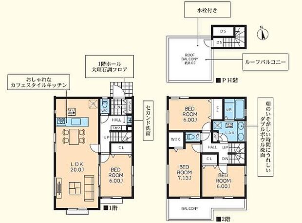 | 間取り | 4LDK 間取り内訳:リビングダイニングキッチン 20帖(1階)・洋室 6帖(1階)・洋室 6帖(2階)・洋室 7.1帖(2階)・洋室 6帖(2階) |
