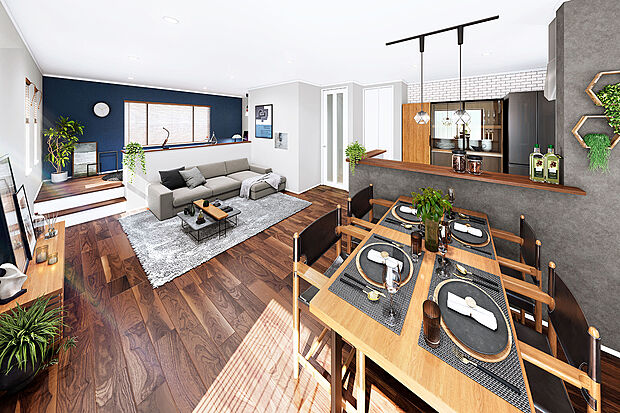 • ブラックウォルナットの床材が、落ち着きを与えるリビング空間。三種類のアクセントクロスが、互いに引き立て合い、より洗練されたインテリアを実現いたします(イメージ画像)
