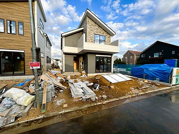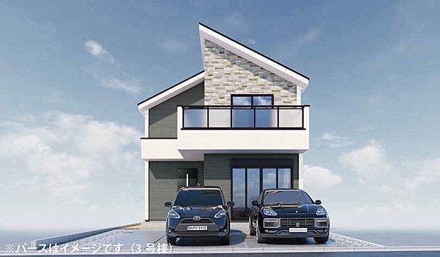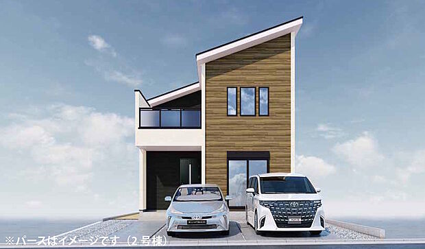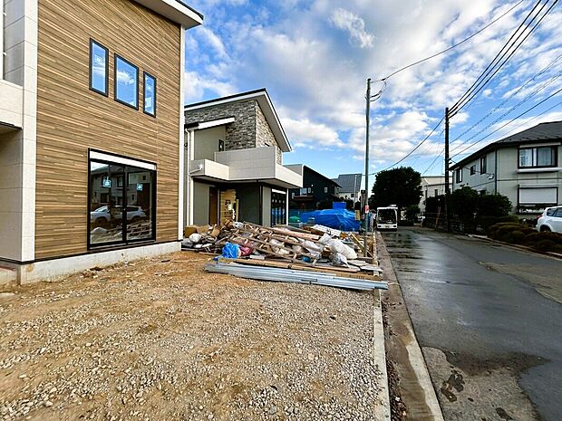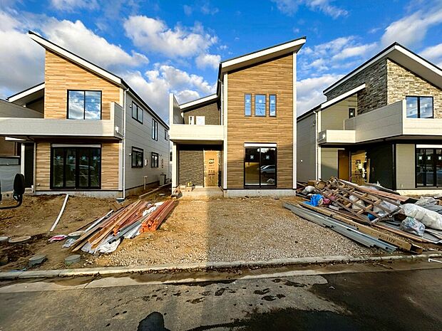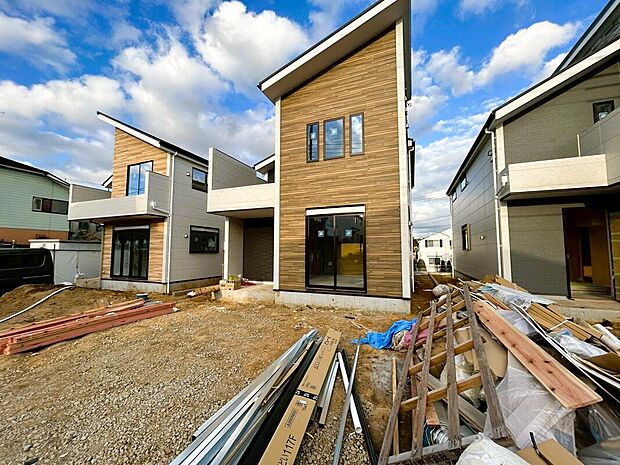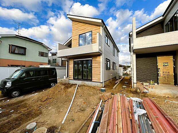 【1】東山田小学校/東山田中学校のエリア 【2】都市ガス/並列駐車2台できます! 【3】直線的な片流れのフォルム、素材の切り替え、モノトーン×木目のコントラスト
