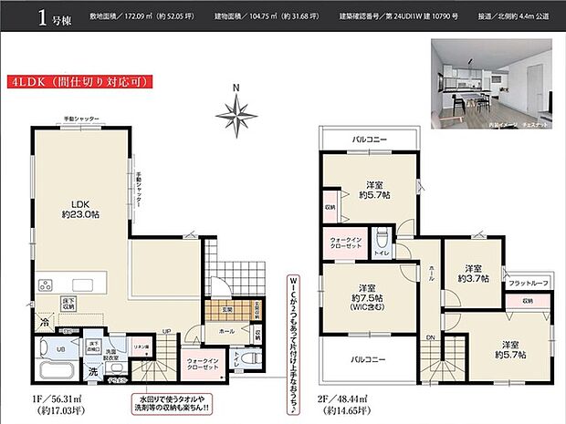 間取り内訳:リビングダイニングキッチン 23帖・洋室 7.5帖・洋室 5.7帖・洋室 5.7帖・洋室 3.7帖