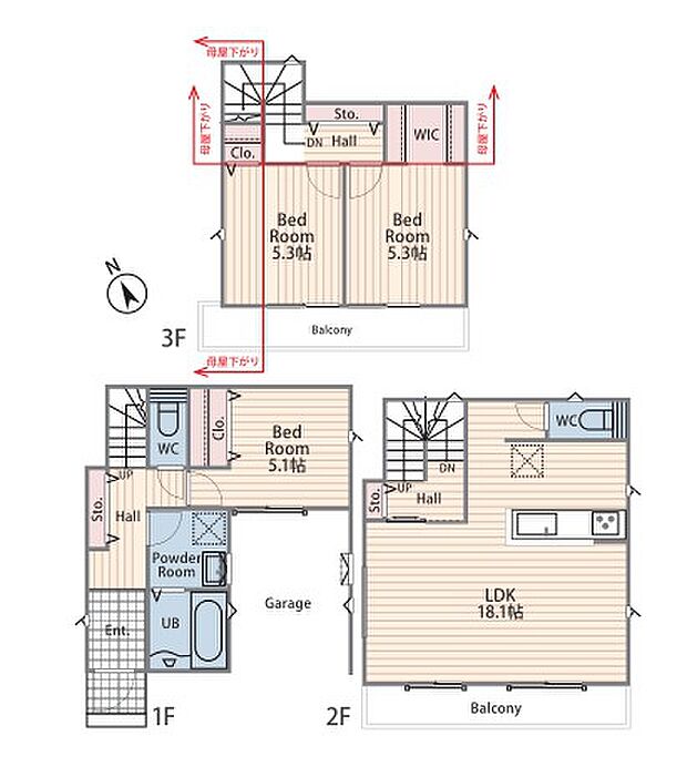 | 間取り | 3LDK 間取り内訳:リビングダイニングキッチン 18.1帖(2階)・洋室 5.7帖(1階)・洋室 5.3帖(3階)・洋室 5.3帖(3階) |